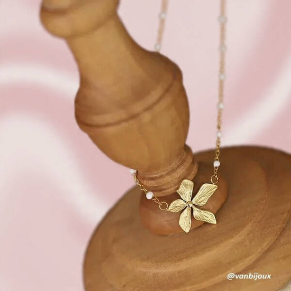 Collier Chaîne avec Perles Blanches et Pendentif Fleur – Acier Inoxydable Doré – 41 cm + 5 cm| vanbijoux