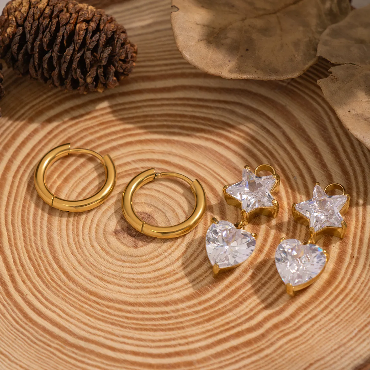 Boucles d’oreilles pendantes étoile et cœur en zircon – Acier inoxydable doré