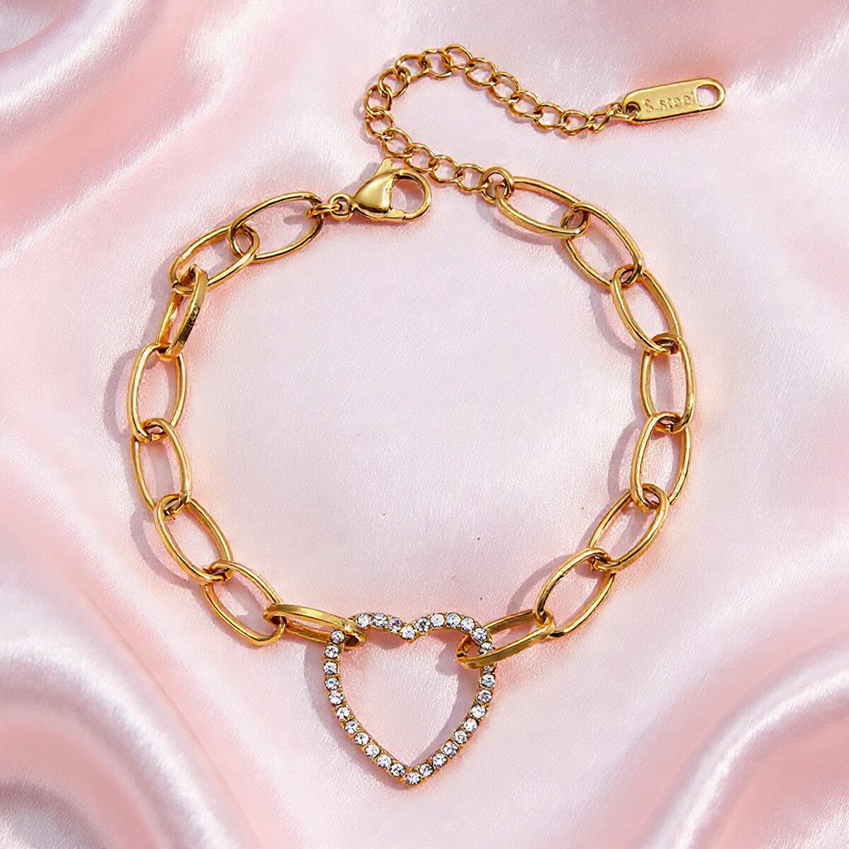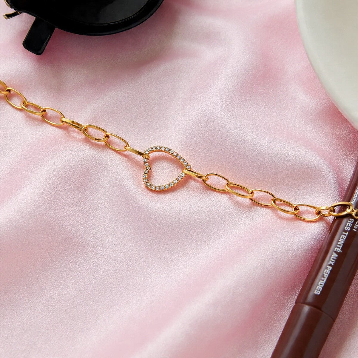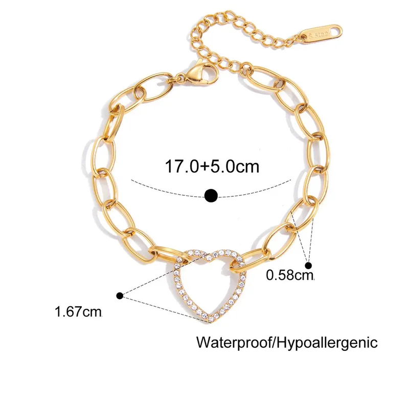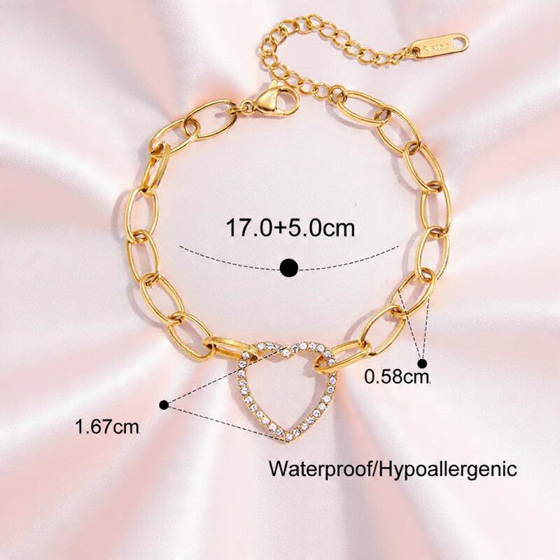 Bracelet classique femme en acier inoxydable doré avec cœur en strass – Chaîne amovible 17+5 cm