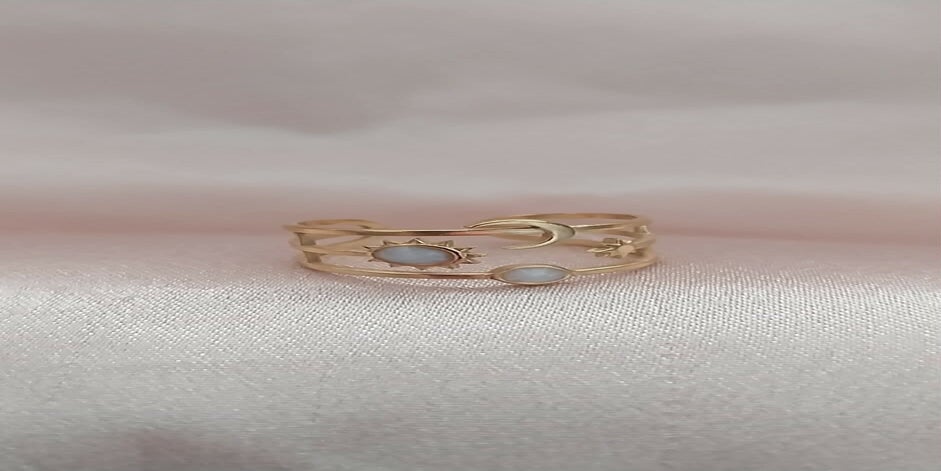 Bague Séléné Ouverte Céleste Soleil Lune Étoile – Pierres Blanches Opale Dorée Ajustable Acier Inoxydable 304