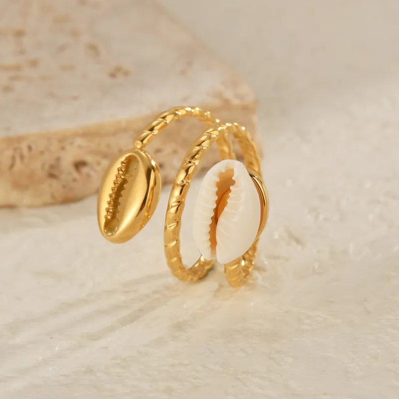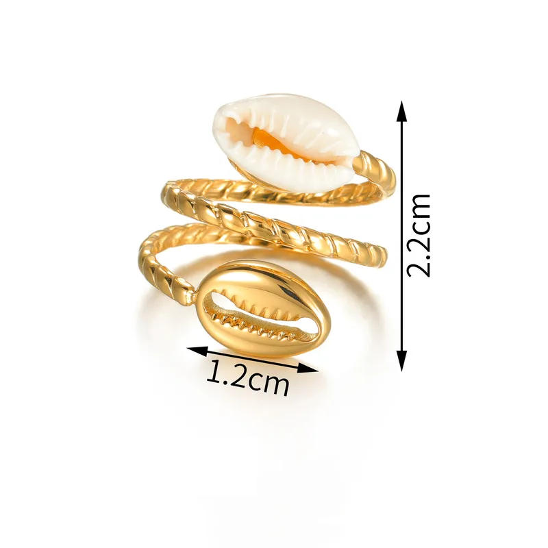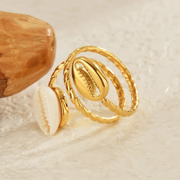Bague Spirale Dorée Acier Inoxydable | Cauris Naturel et Or | Réglable Femme Plage