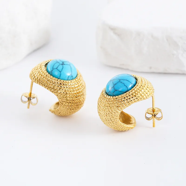 Sublimez votre style avec ces élégantes boucles d’oreilles en forme de C, ornées en leur centre d’une pierre naturelle turquoise. Conçues en acier inoxydable 304 de haute qualité, elles sont disponibles en finition dorée, pour s’adapter à toutes vos envies et à chaque carnation.