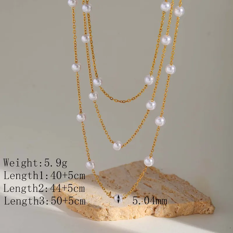 Collier à trois couches en chaînes de câbles avec des perles d'imitation | Acier inoxydable doré | Vanbijoux