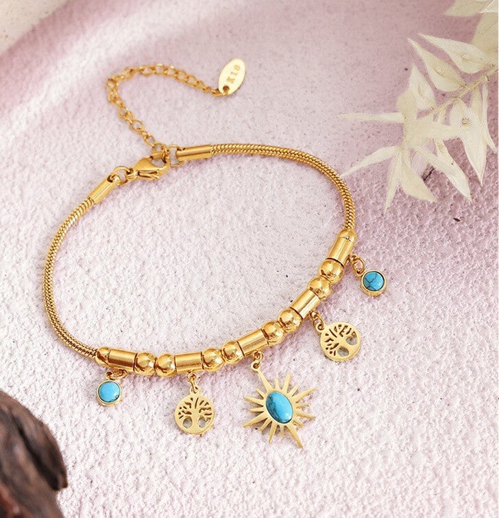 Bracelet Pampille Arbre de vie & Pierre Naturelle Turquoise - Acier au Titane Doré