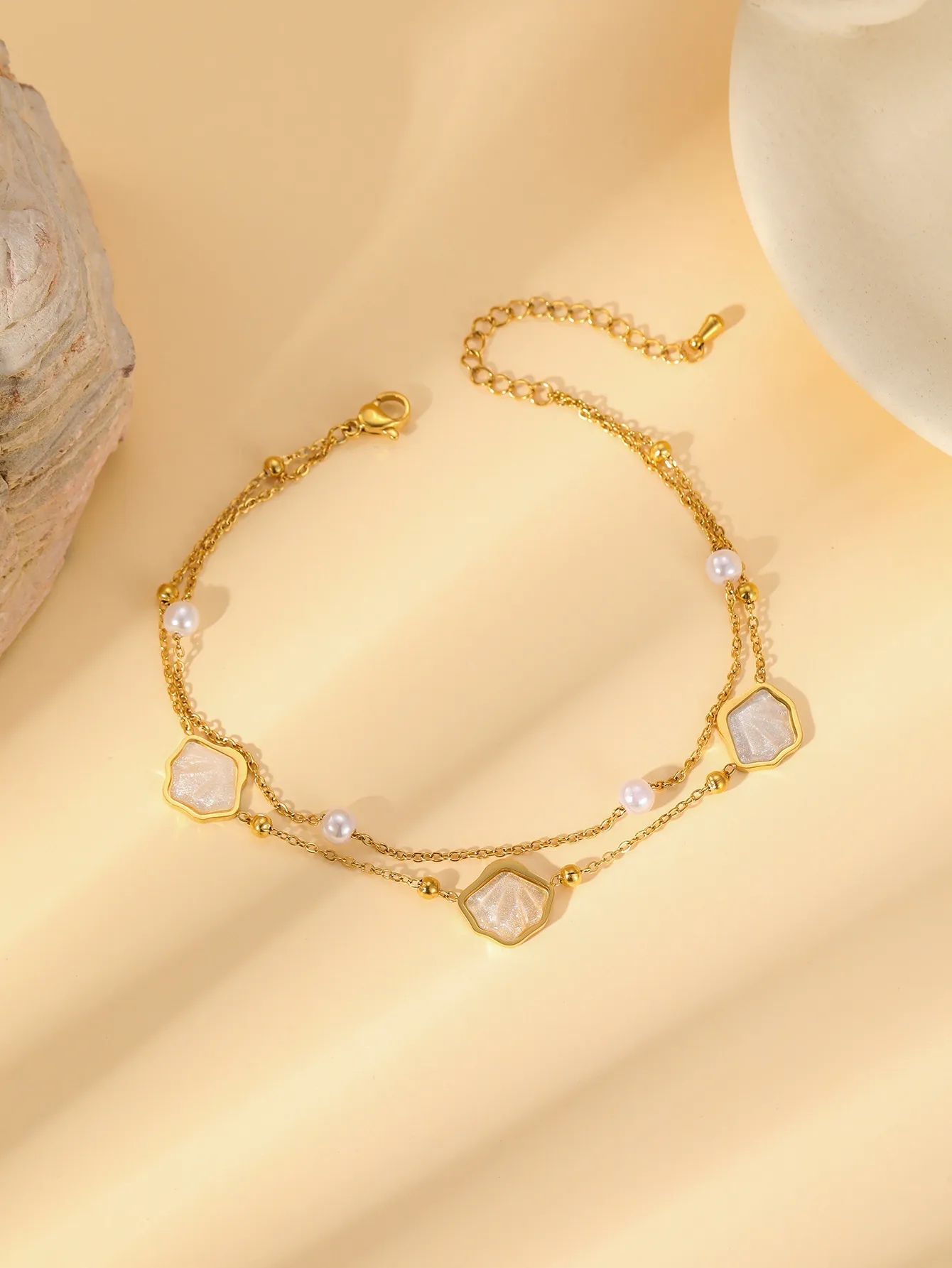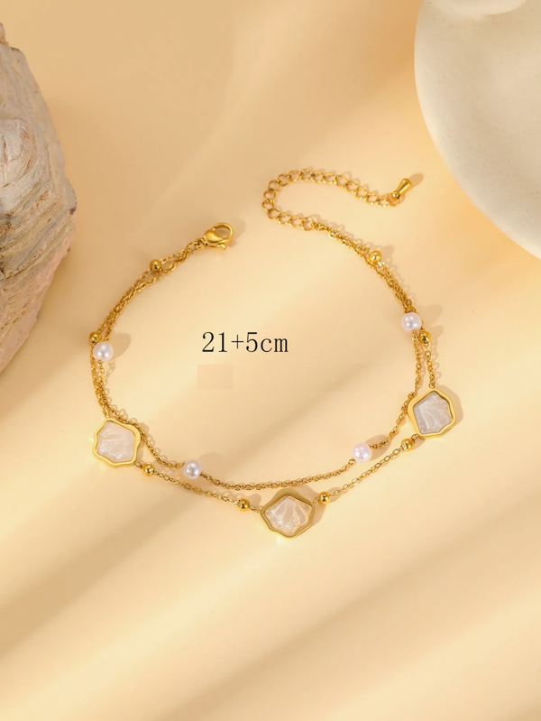 Bracelet de cheville double rang en perles nacre blanc brillant – Acier inoxydable doré