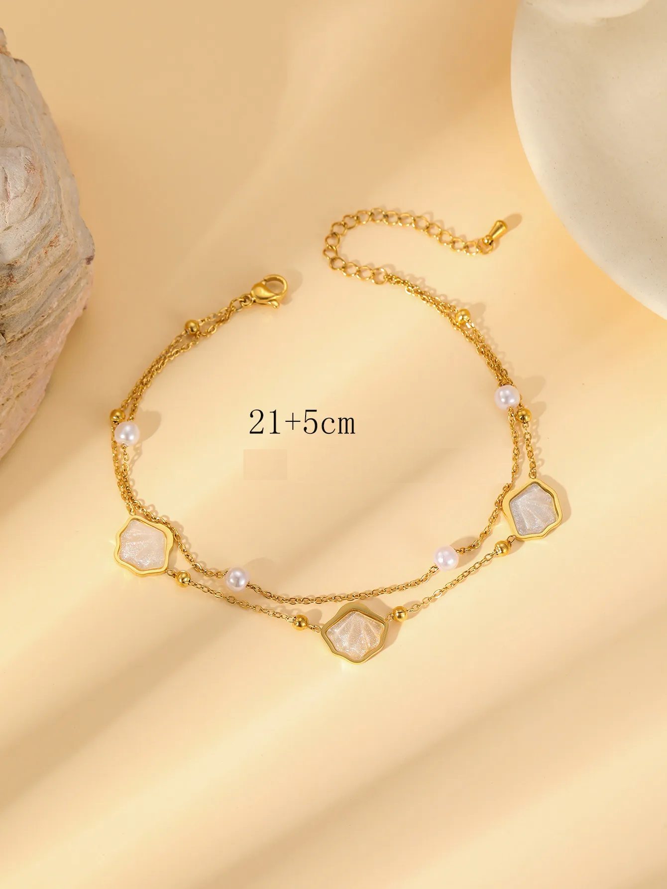 Sublimez votre cheville avec ce bracelet double rang élégant, orné de perles nacre blanc brillant et conçu en acier inoxydable doré de haute qualité. Avec sa longueur de 21 cm et une extension de 5 cm, ce bijou s’adapte parfaitement à toutes les tailles, offrant un confort optimal et un style raffiné.