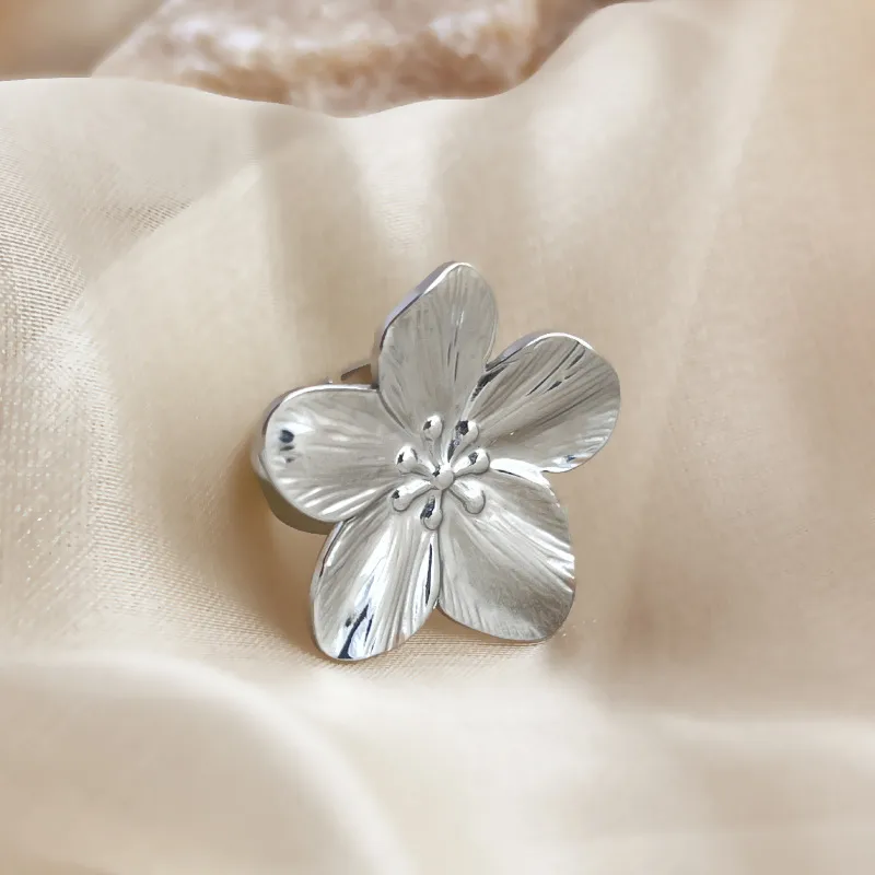 Massive et poétique, la Bague Magnolia fait fleurir votre main. Une grande fleur à 5 pétales en acier argenté, striée pour imiter les nervures naturelles, avec un cœur en pistils bombés. Un bijou statement floral qui allie douceur et caractère.