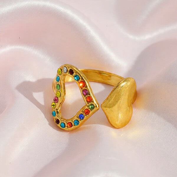 Bague Ajustable Deux Cœurs Sertis de Strass Multi couleur – Acier Inoxydable Doré