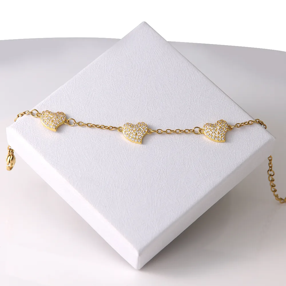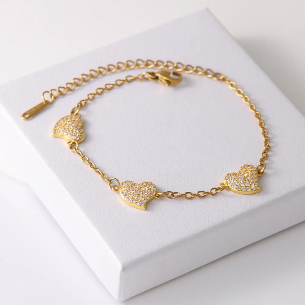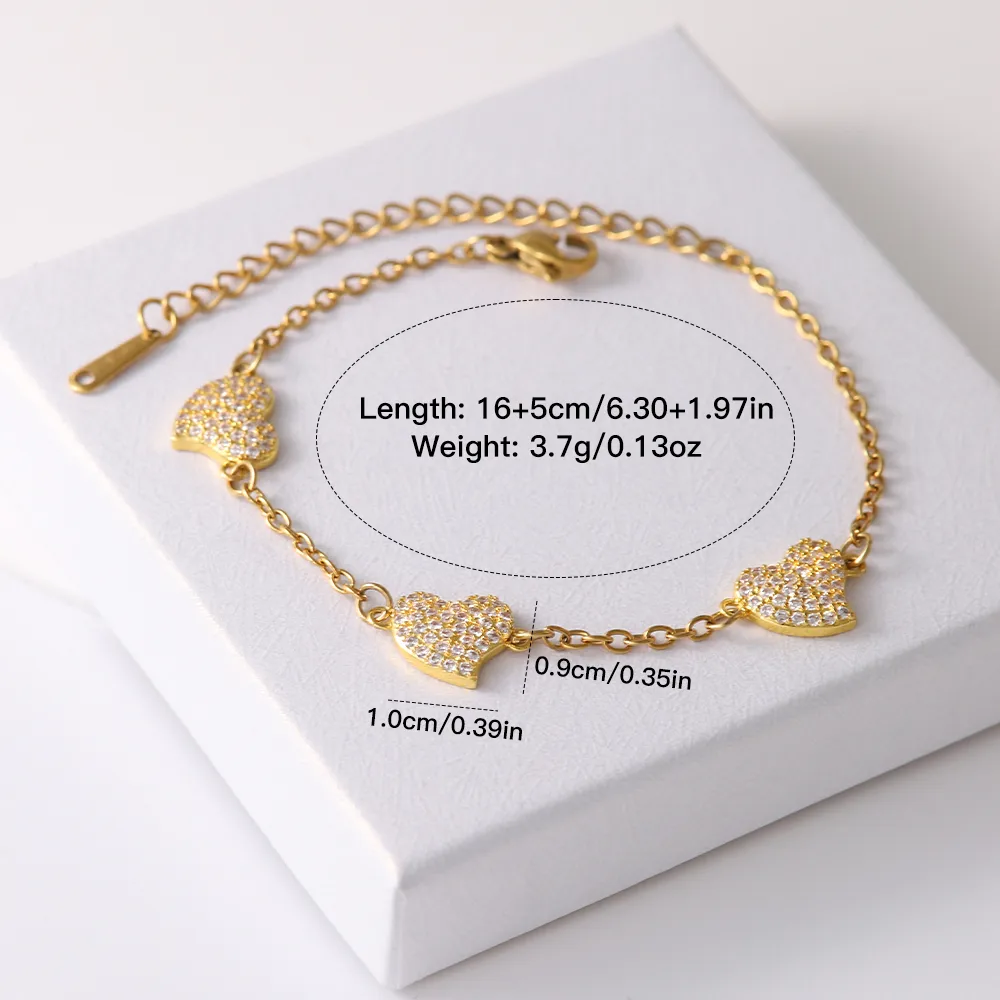 Bracelet de Cheville Doré – Cœurs Incrustés de Zircon en Acier Inoxydable 304 & Cuivre (16 + 5 cm)