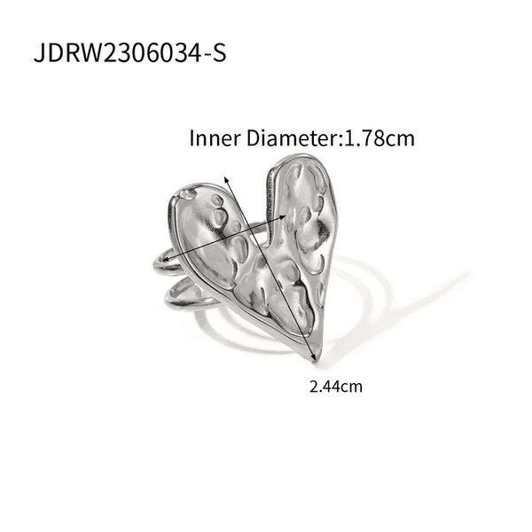 Affirmez votre style avec cette bague audacieuse et élégante en forme de cœur martelé. Son design unique, à la fois moderne et artistique, attire le regard et exprime parfaitement l’alliance entre romantisme et caractère.