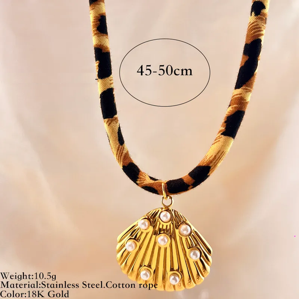 ✨ Collier Pendentif Léopard Vintage coquillage perle – Acier Inoxydable & Corde Coton ✨