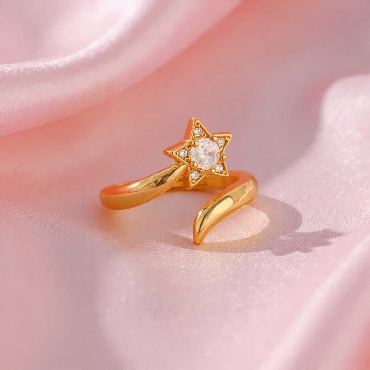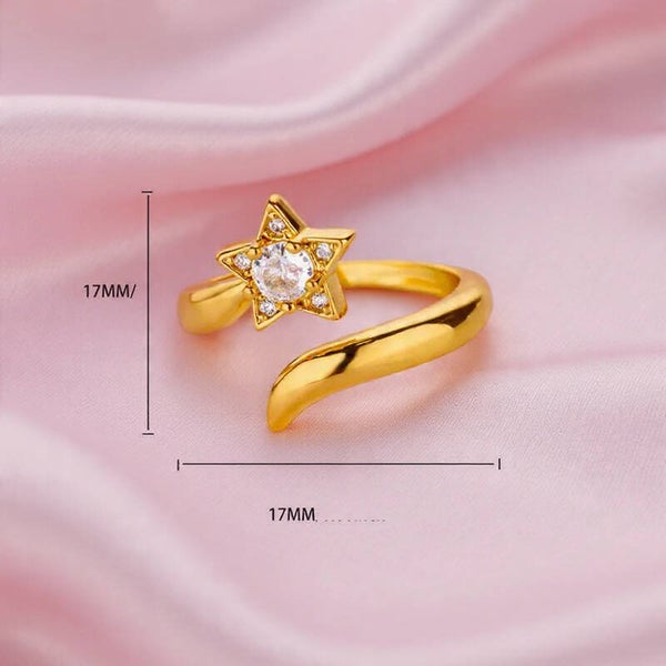 Apportez une touche de lumière à vos mains avec cette bague raffinée au design étoile. Conçue en acier inoxydable doré, elle allie élégance et résistance pour un bijou qui vous accompagnera au quotidien sans ternir. Son étoile délicatement ornée de strass brillants reflète la lumière à chaque mouvement, ajoutant une note glamour et féminine à votre style.