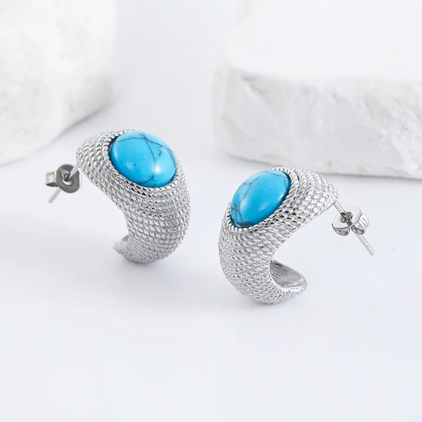 Sublimez votre style avec ces élégantes boucles d’oreilles en forme de C, ornées en leur centre d’une pierre naturelle turquoise. Conçues en acier inoxydable 304 de haute qualité, elles sont disponibles en finition argentée, pour s’adapter à toutes vos envies et à chaque carnation.
