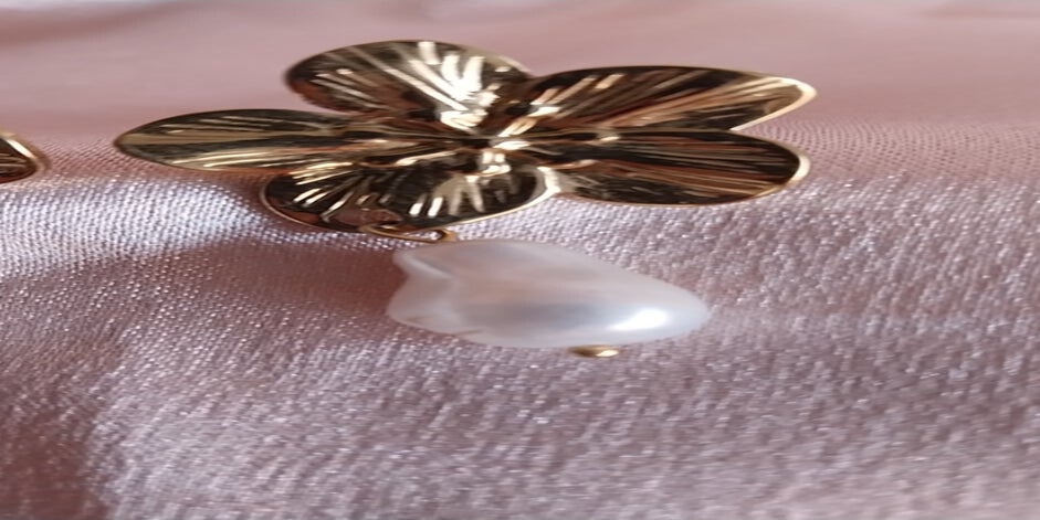 Boucles d’Oreilles Fleur Dorée & Perle – Acier Inoxydable (4,23 x 2,27 cm, Perle 1 cm)