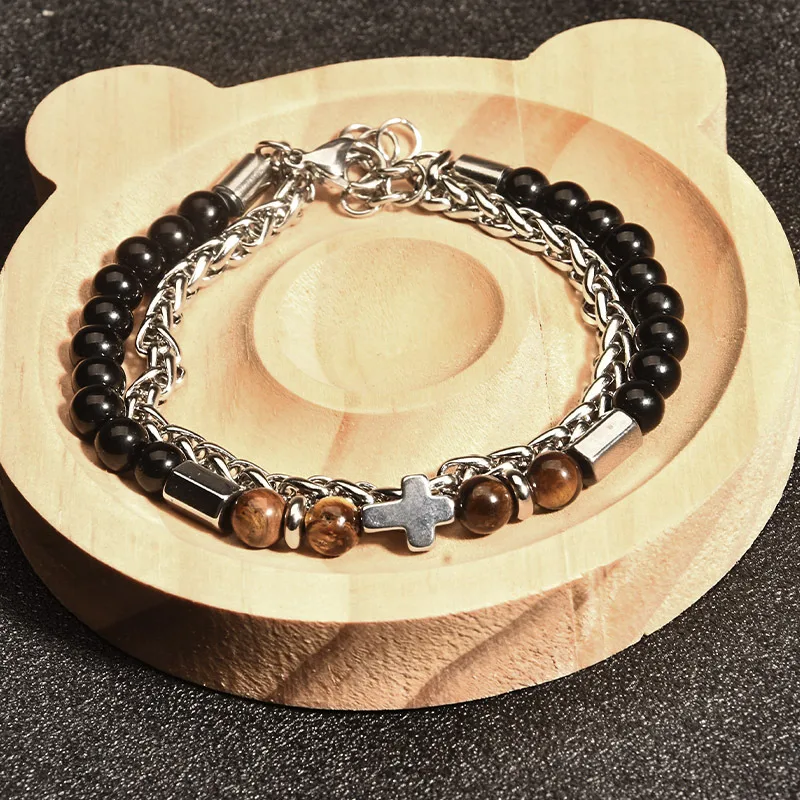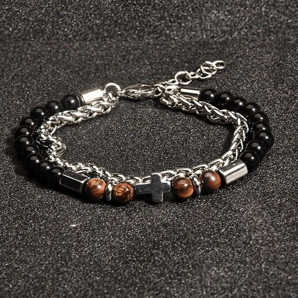 Bracelet Homme Design Croix et Perles œil du tigre – Acier Inoxydable 19 + 5 cm