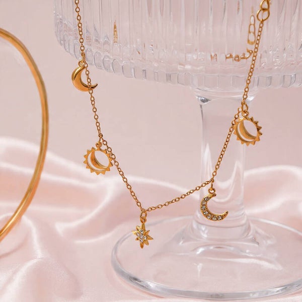 Son design délicat mêle une étoile scintillante et un croissant de lune doré, symboles de lumière et de rêve, suspendus à une chaîne fine à maillons câblés pour un rendu élégant et féminin.