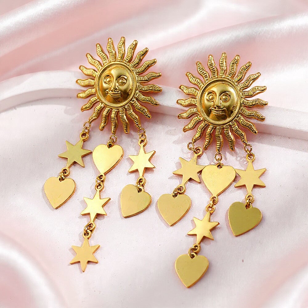 ✨Éblouissantes boucles d’oreilles dorées en forme de soleil, ornées d’une délicate chaînette décorée de cœurs et d’étoiles. Conçues en acier inoxydable 304, elles résistent à l’eau et ne ternissent pas.
