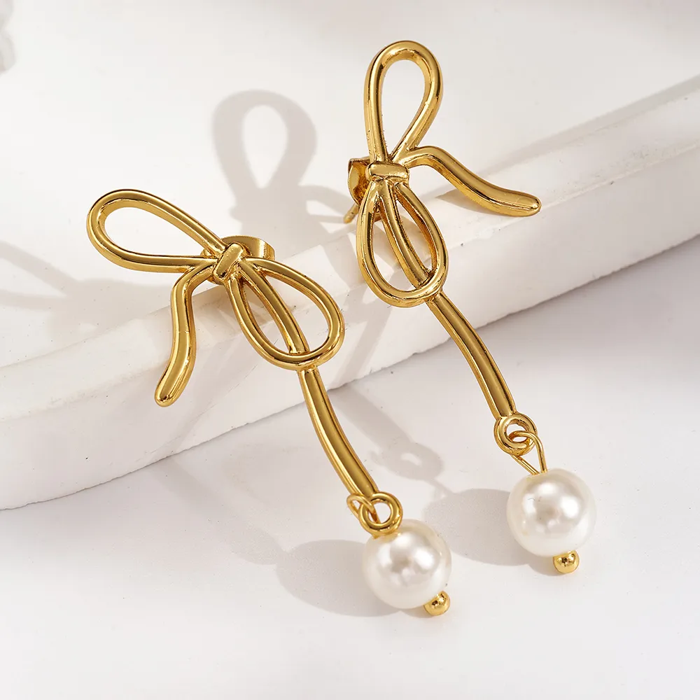 🎀Boucles d’Oreilles Élégantes Femme – Nœud Papillon & Imitation Perle – Acier Inoxydable 304 Doré – Design Creux Raffiné