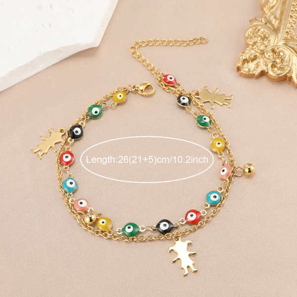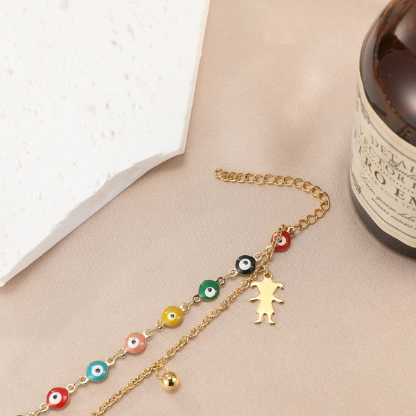 ✨ Bracelet de pied doré œil protecteur coloré – double rang avec grelot ✨
