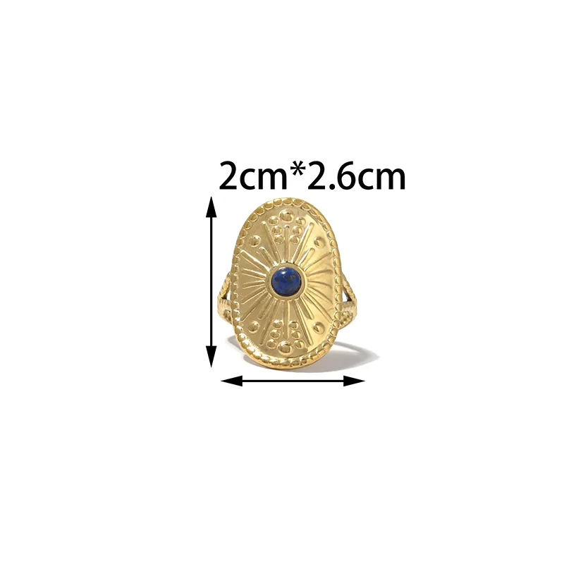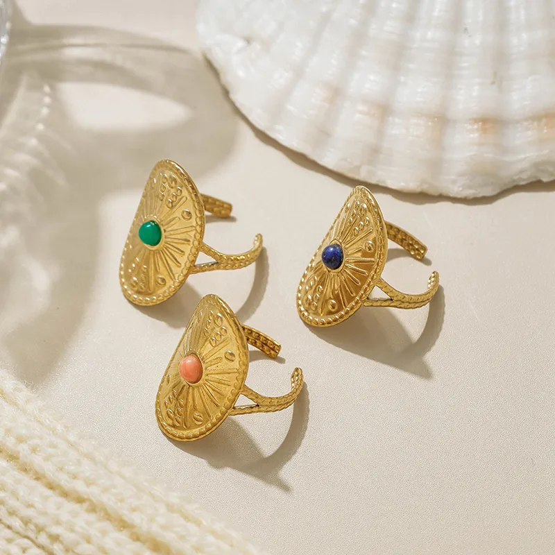 Fabriquée avec soin dans un métal doré de haute qualité (comme l'acier inoxydable plaqué or pour une durabilité et une brillance exceptionnelles), cette bague fantaisie est non seulement résistante mais aussi hypoallergénique. Son motif délicatement gravé tout autour de la pierre rappelle les rayons du soleil, ajoutant un charme bohème et chic à ton style.