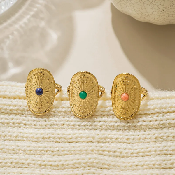 Découvre notre magnifique bague ovale dorée "Éclat Solaire", une pièce maîtresse qui allie élégance vintage et touche moderne ! ☀️ Inspirée par la lumière du soleil, son design unique met en valeur une pierre de couleur vibrante (bleue, verte ou corail) sertie en son cœur, apportant une touche de gaieté à toutes tes tenues.
