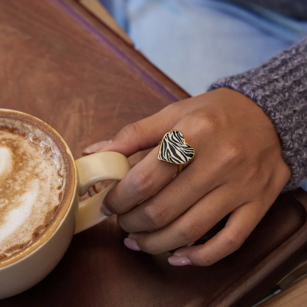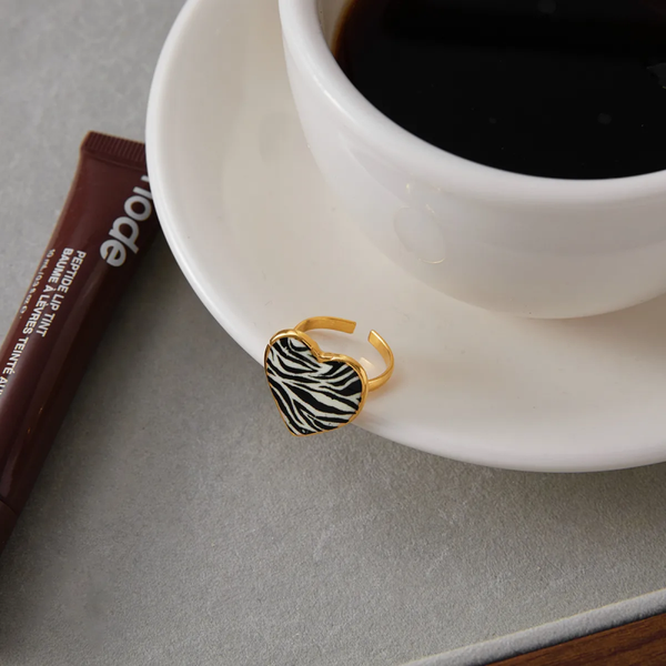 Affirmez votre personnalité avec cette bague ajustable en forme de cœur, sublimée par un motif zébré noir et blanc au fini brillant. Confectionnée en acier inoxydable doré, elle allie robustesse, confort et éclat durable.