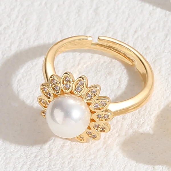 Éclat et féminité avec la bague tournesol dorée à perle nacrée