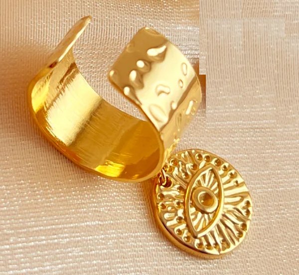 Apportez une note mystérieuse et raffinée à votre look avec cette bague ouverte en acier inoxydable doré, sublimée par une finition martelée artisanale. Au centre, une breloque en forme d’œil doré capte la lumière et attire le regard, symbole de protection, d’intuition et de clairvoyance, revisité dans un design moderne et élégant.