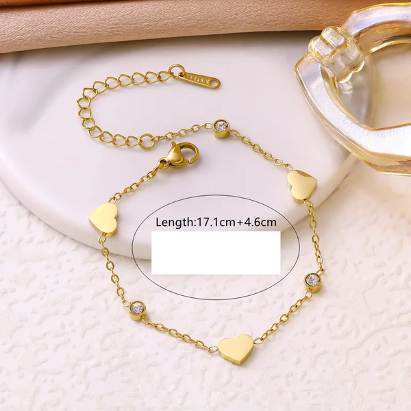 Bracelet Femme Doré en Acier Inoxydable – Pendentif Cœur et Rond Strass, 17,1 cm + 4,6 cm