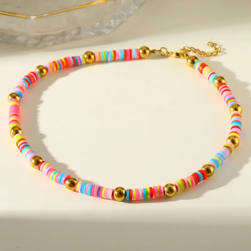 - Palette de Couleurs Vibrante : Les perles Heishi offrent un arc-en-ciel de couleurs vives, rendant ce collier facile à associer avec des tenues neutres pour une touche de couleur, ou avec des looks plus audacieux.