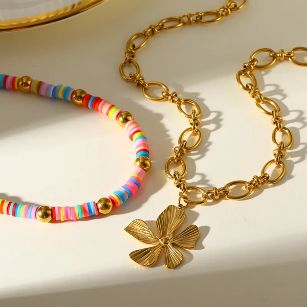 Collier Double Rang "Éclat Bohème & Fleur Dorée" en Acier Inoxydable & Perles Heishi