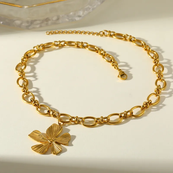 - Rang Inférieur – "Fleur Dorée" : Une chaîne dorée plus longue, à maillons ovales épais et légèrement texturés, suspendant un grand pendentif en forme de fleur à quatre pétales. La fleur est texturée, rappelant un aspect froissé ou martelé, ce qui lui donne du relief et du caractère.