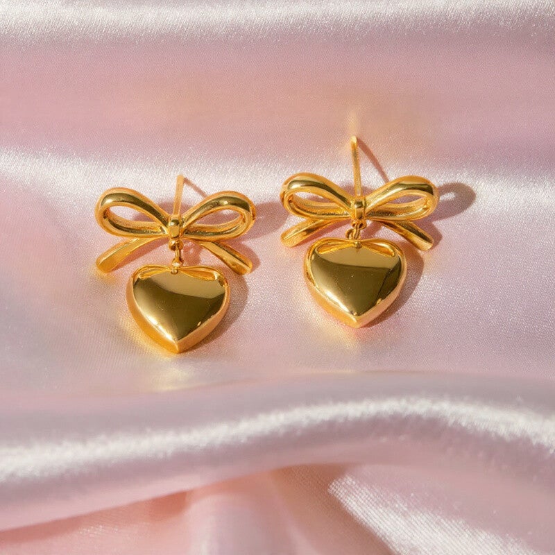 Boucles d’Oreilles Cœur & Nœud Élégant – Acier Inoxydable 304 doré
