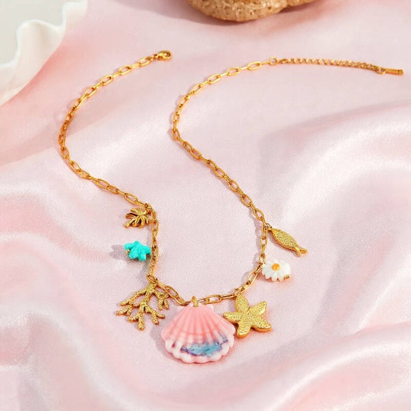 - Design Enchantant : La fine chaîne à maillons ovales est élégamment parsemée de diverses breloques marines : une grande coquille Saint-Jacques aux teintes roses et bleues dégradées (3.0 cm), une étoile de mer dorée, un corail doré, une petite breloque en forme de feuille dorée, et une charmante petite fleur blanche et turquoise.