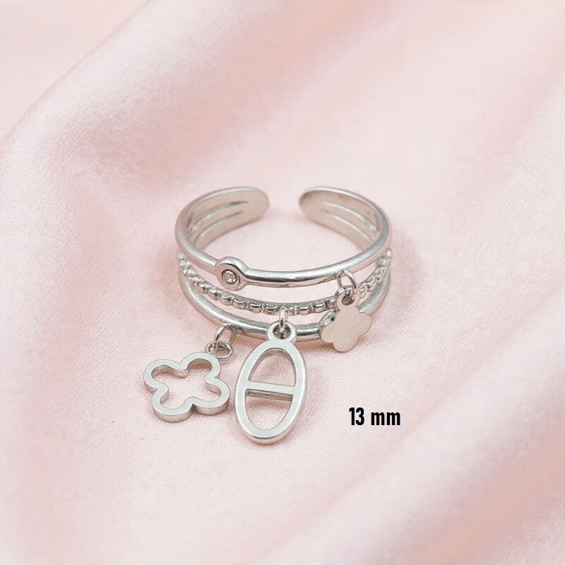 Apportez une touche de fantaisie et de chance à votre quotidien avec notre bague ajustable "Porte-Bonheur Multi-Breloques". Ce bijou unique en acier inoxydable argenté combine un design moderne à trois anneaux avec de charmantes breloques, parfait pour exprimer votre personnalité avec style et légèreté.