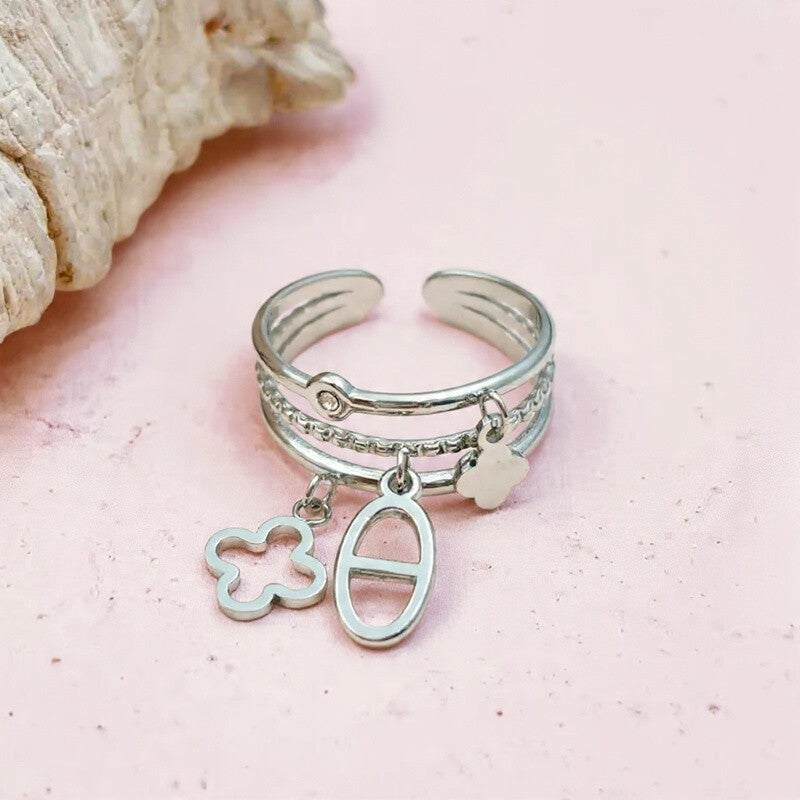 Bague Ajustable "Porte-Bonheur Multi-Breloques" en Acier Inoxydable Argenté