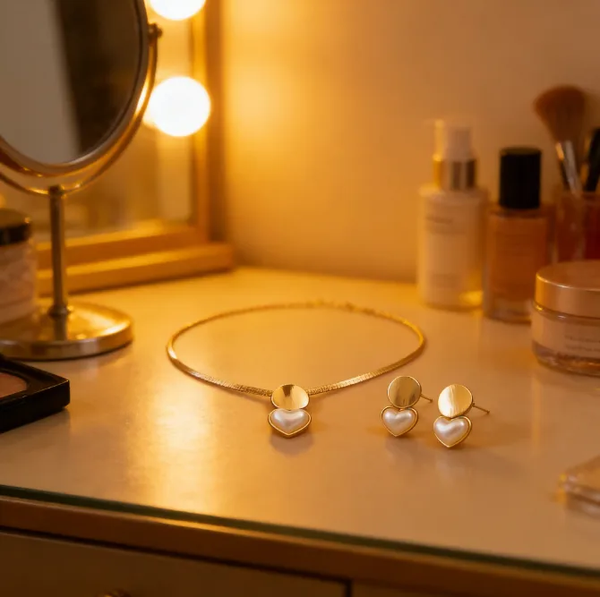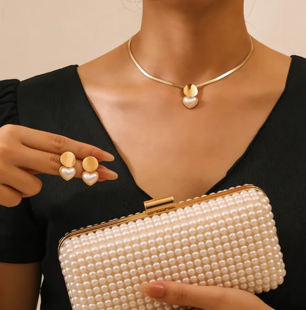 Apportez une touche de sophistication intemporelle à votre look avec notre magnifique Parure Collier Ras-de-Cou et Boucles d'Oreilles Cœur Nacre Doré ! Cet ensemble harmonieux est le parfait équilibre entre modernité et délicatesse, conçu pour la femme élégante et raffinée.