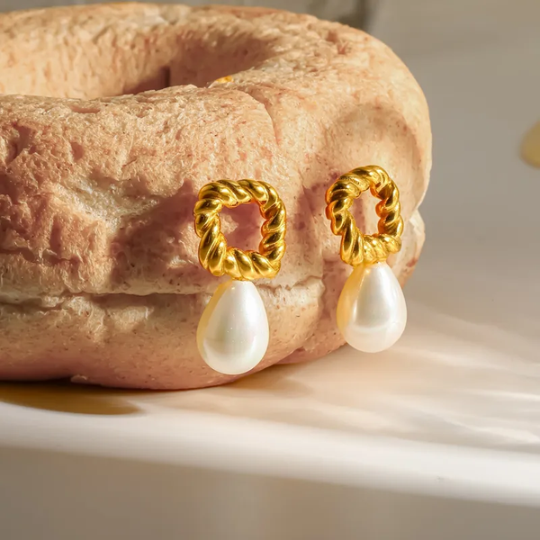 Boucles d'Oreilles Carré Torsadé & Perle Goutte Acier Inox 304 Doré | Clous Pendants Géométriques Femme | Chic & Moderne