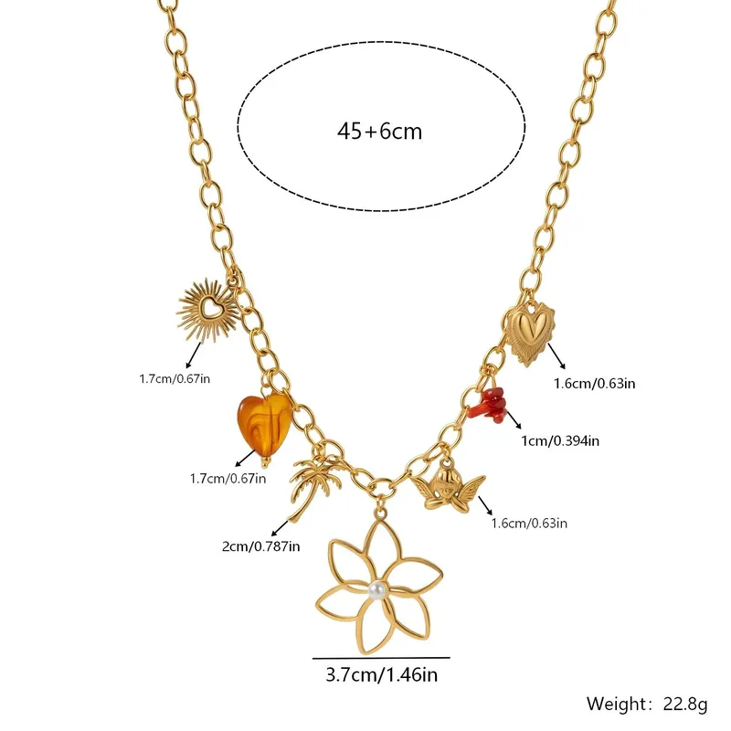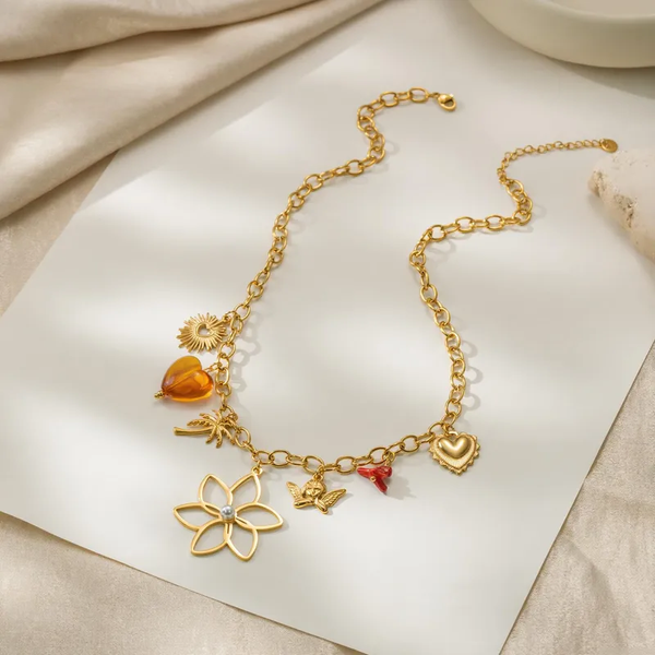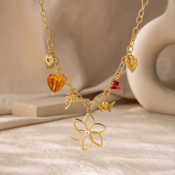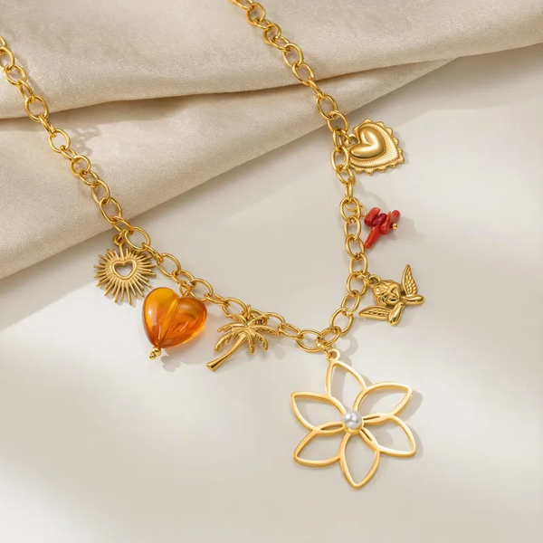 Porté sur une chaîne à maillons ovales de caractère, ce collier rassemble une collection de charms iconiques : un cœur ajouré soleil, un cœur ambre transparent, un palmier, un petit corail rouge, un cœur sacré détaillé et une grande fleur ajourée avec perle centrale. Chaque breloque est finement travaillée pour un rendu lumineux et plein de poésie.