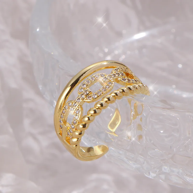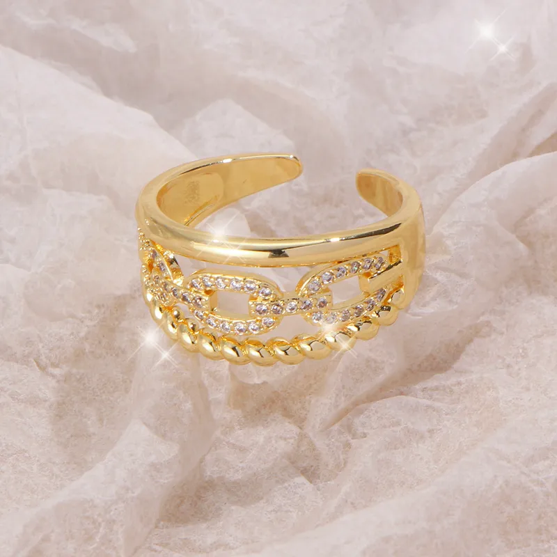 Cette bague large est composée de trois anneaux soudés pour un rendu volumineux et parfaitement harmonieux : un anneau torsadé, un anneau chaîne à maillons ovales texturés sertis de zircons scintillants, et un anneau jonc lisse. Le mix des textures et des finitions capte la lumière sous tous les angles et apporte une dimension luxueuse à votre main.