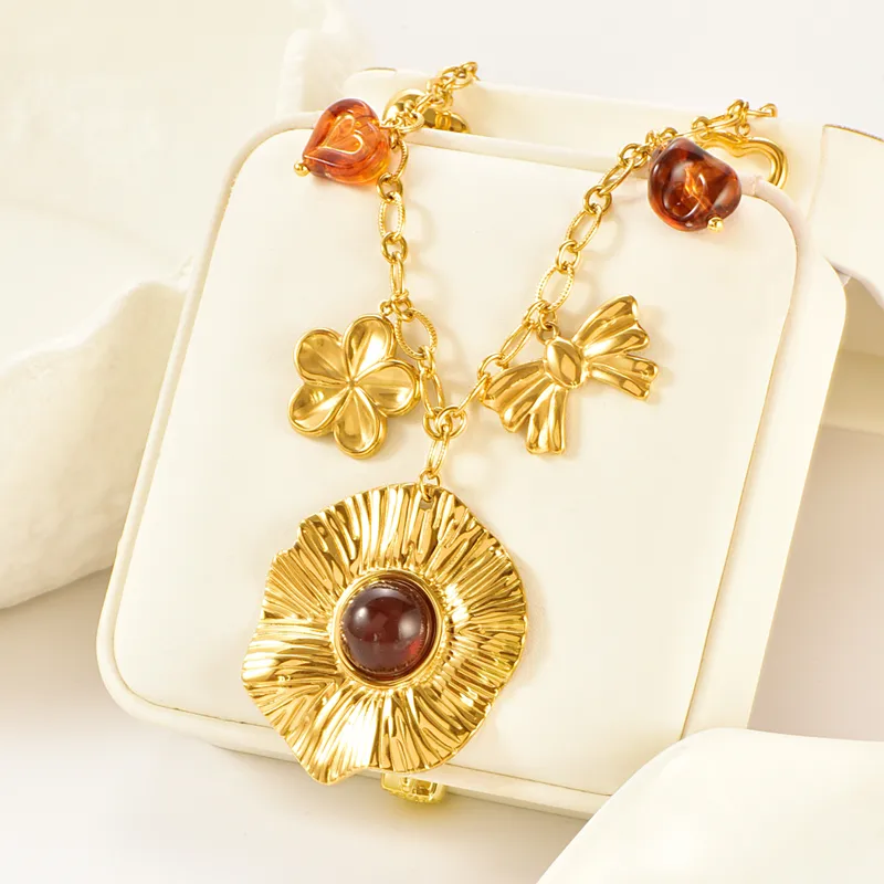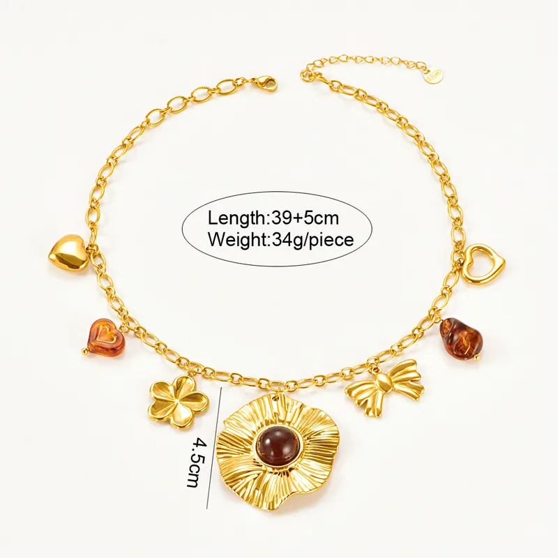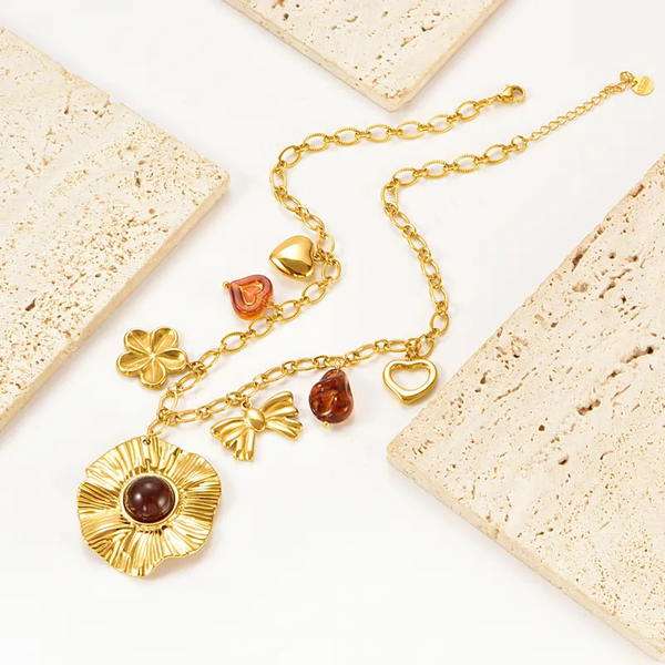 Collier Charms Fleur Ambre Acier Inox 304 PVD Doré | Sautoir Multi-Breloques Cœur Nœud | Chaîne Câble 39+5cm