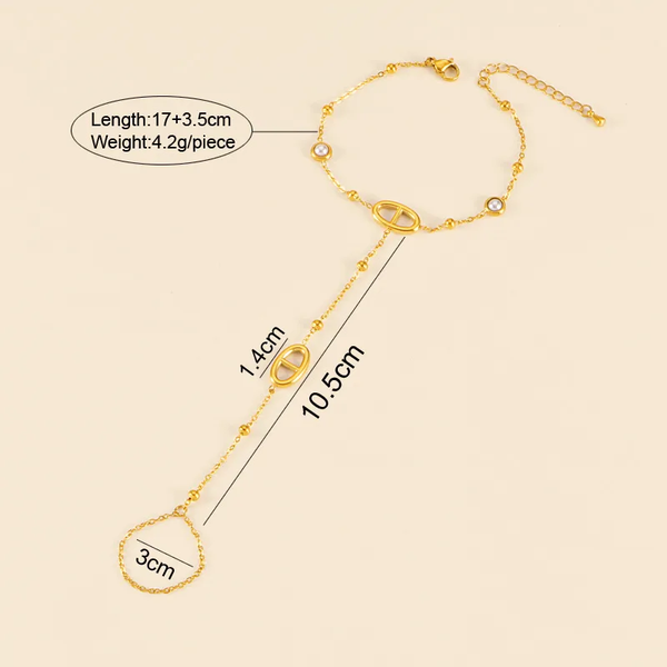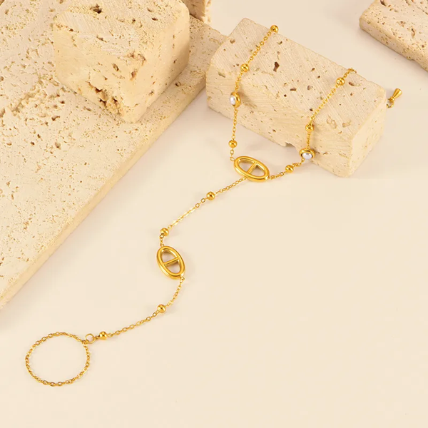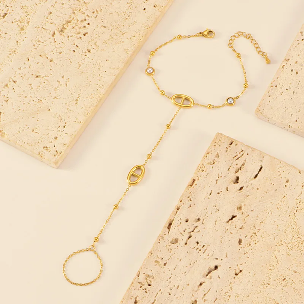 Ce bijou se compose d'un bracelet fin au poignet et d'une bague chaîne qui viennent s'unir par une chaîne délicate ponctuée de petites boules dorées. Deux maillons ovales de style "maille marine" viennent structurer la ligne avec élégance, tandis que de petits zircons scintillants sont sertis sur le bracelet pour capter la lumière à chacun de vos mouvements.
